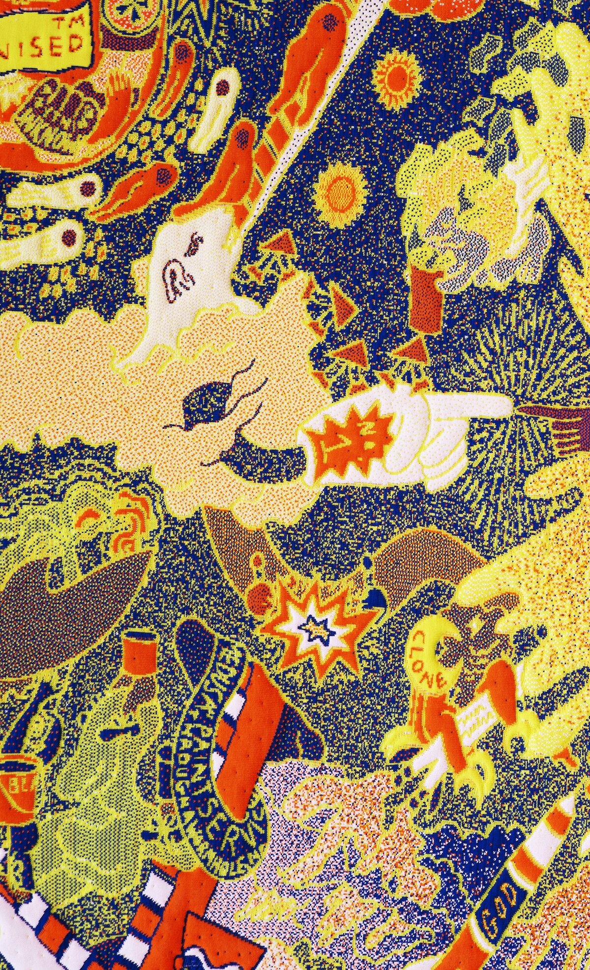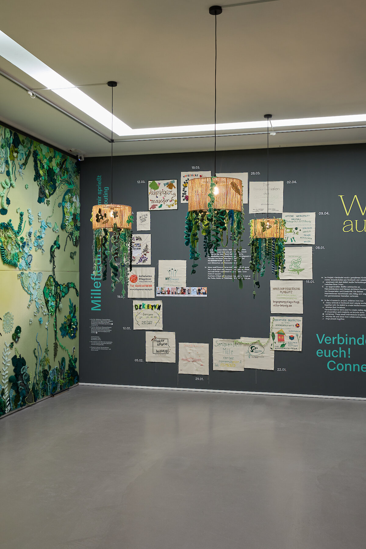 Abb. 1: Faden Atelier in der Ausstellung Welt aus Fäden. Bildteppiche der Moderne, Ausstellungsansicht, 2026, Foto: Alexander Schmidt/PUNCTUM | Abb. 2: Eduard Einschlag, Selbstporträt, um 1924, 1927 Schenkung von Hermann Halberstam, MdbK | Abb. 3: Rosa Barba, Under the Canopy, 2025, Ausstellungsansicht, Foto: Alexander Schmidt/PUNCTUM, © VG Bild-Kunst Bonn, 2026 | Abb. 4: Fanja Bouts, A Largely Distorted yet Surprisingly Ordered Map of Regular Irregularities: a Dense Description of the Present-Day History of the Future (Detail), 2023, Ausstellungsansicht MdbK, Leihgabe der Künstlerin, Foto: Alexander Schmidt/Punctum, © Künstlerin | Abb. 5: Abbildung des Essaycovers Bildökologie von Michael Klipphahn-Karge, 2026, Foto: Verlag Klaus Wagenbach | Abb. 6: Margareta Behr, Pausensinne, 5-teilige Serie, 2025, © Künstlerin | Abb. 7: Roxana Rios, Herrenbildnis, Sarafina, aus der Werkserie Ode to Eris, 2026 © Künstler*in