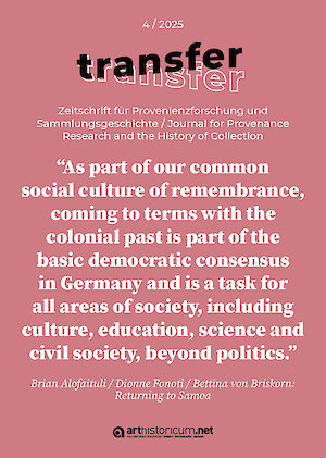 Aktuelle Projekte im Bereich Provenienzforschung sind das von der Kulturstiftung des Freistaates Sachsen geförderte Kooperationsprojekt Sichtbarmachen – Spuren jüdischen Engagements im MdbK, in dem in Zusammenarbeit mit der Publizistin Sharon Adler und der Künstlerin Shlomit Lehavi nach jüdischen Familien geforscht wird, die mäzenatisch für das MdbK tätig waren (s.u.). Ferner wird eine Ausstellung zu jüdischen Familien vorbereitet, die in Leipzig Kunst gesammelt haben, die zum Jahr der jüdischen Kultur in Sachsen 2026 eröffnet wird. Die Provenienzforscherin des MdbK, Dr. Ulrike Saß, ist Mitherausgeberin von „transfer – Zeitschrift für Provenienzforschung und Sammlungsgeschichte | Journal for Provenance Research and the History of Collection“. transfer ist ein internationales wissenschaftliches Publikationsorgan, das in Deutsch und Englisch Ergebnisse der Provenienzforschung und benachbarter Forschungsbereiche digital und Open-Access für ein wissenschaftliches Fachpublikum und die interessierte Öffentlichkeit zugänglich macht. Im Dezember 2025 ist die vierte Ausgabe erschienen. Die Online Publikation finden Sie hier. |